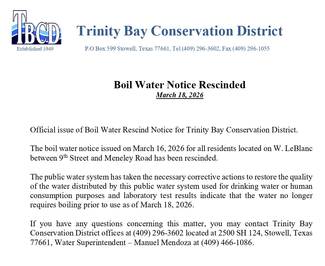 Trinity Bay Conservation District is a conservation and reclamation district formed and approved by the Texas House and Senate in May of 1949. The primary functions of TBCD are to provide storm water drainage and water and sewer services for most of East Chambers county and a portion of West Jefferson County in far Southeast Texas. Our office is located at 2500 SH 124, Stowell, Texas. Our phone number is (409) 296-3602.